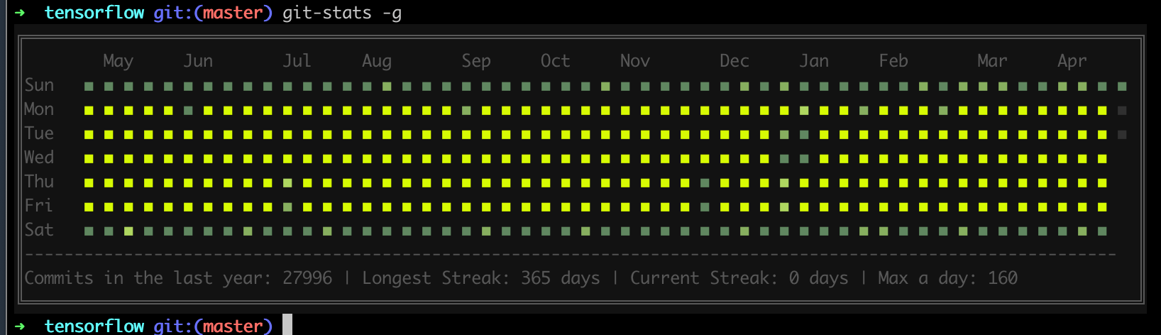 Each of the four sources of git stats has its benefits. For most people that simply want a quick & dirty assessment of the activity in their repo, we recommend the command line options. They are readily available, and even in large repos like Tensorflow, git shortlog can run complete within seconds.