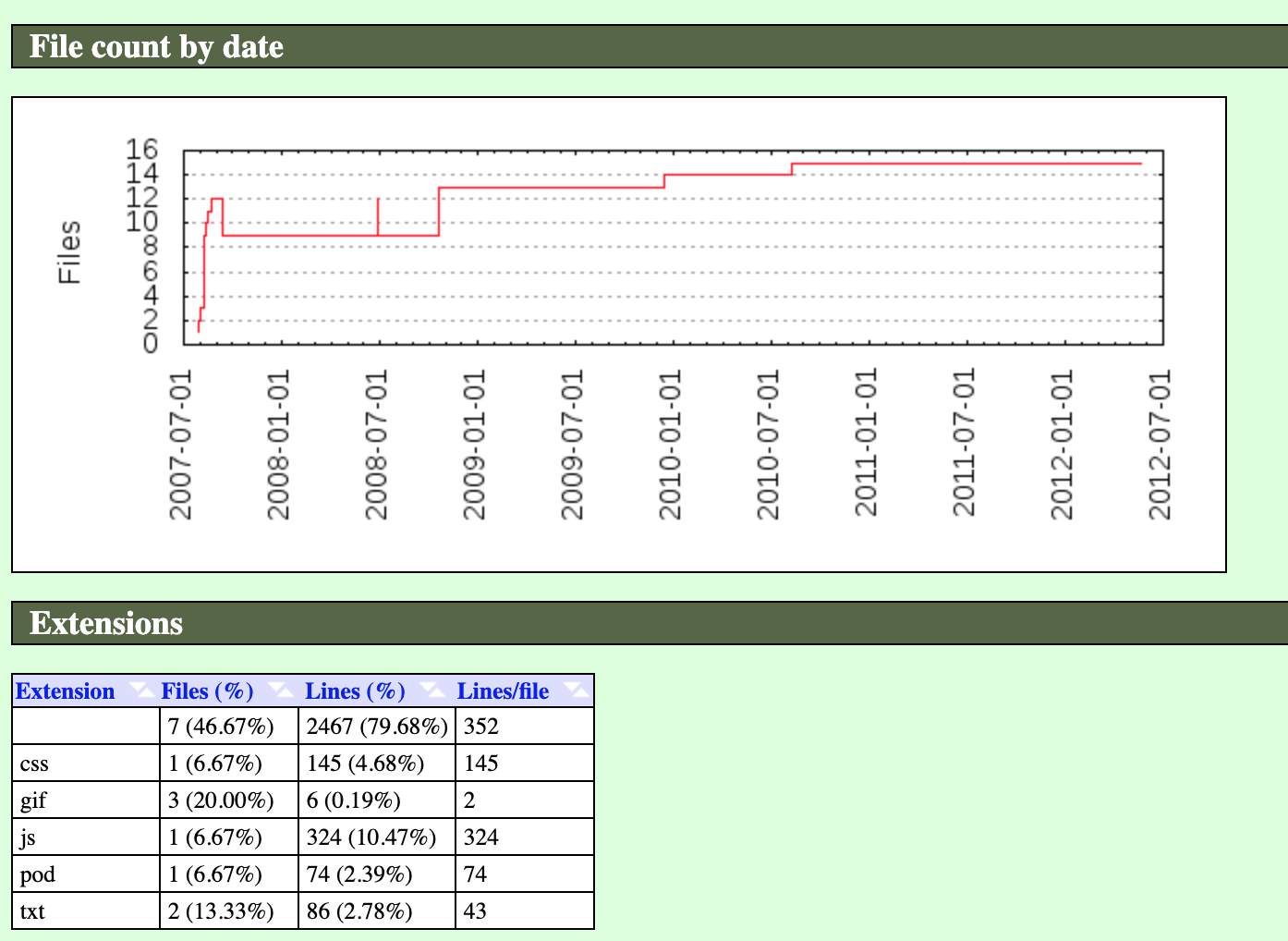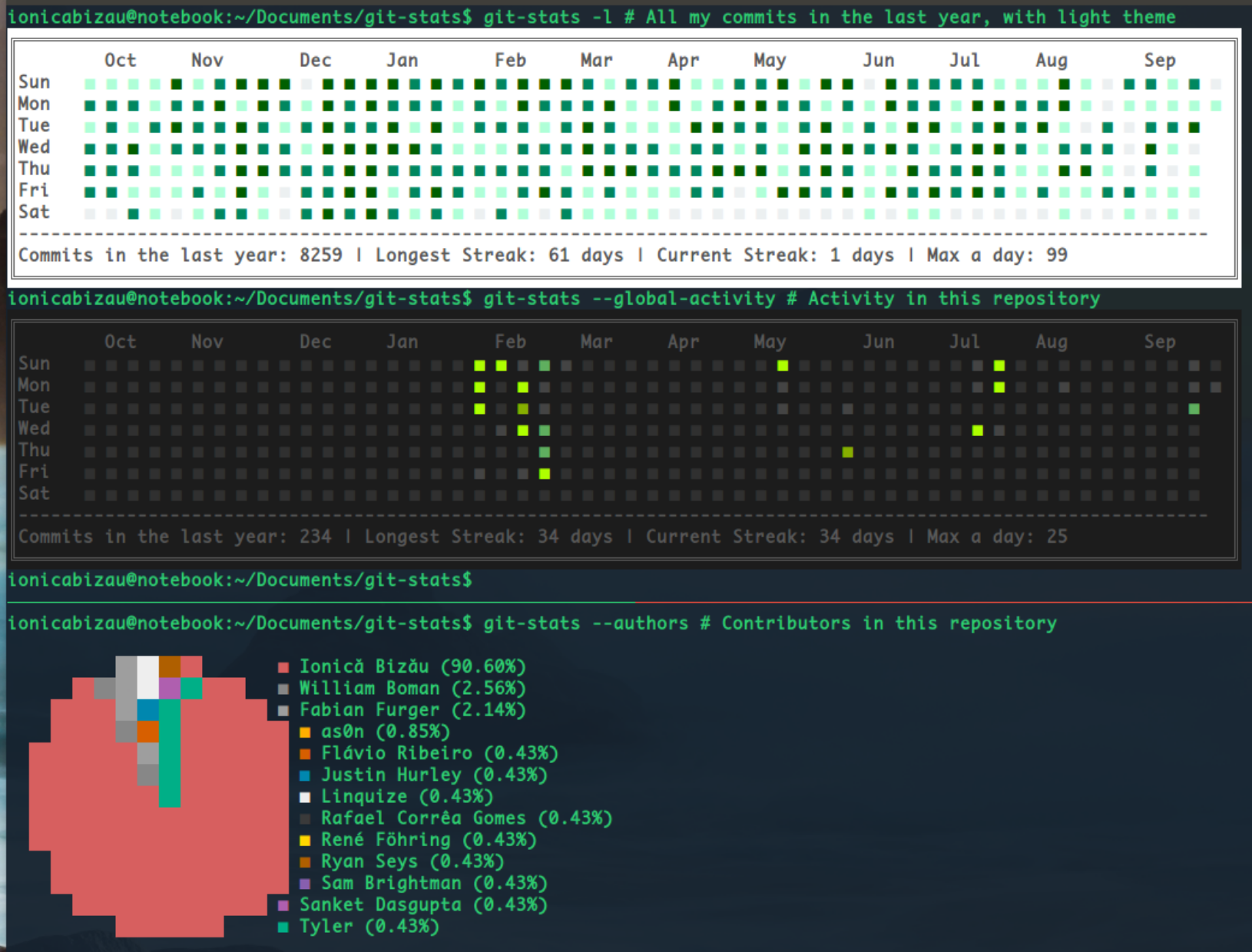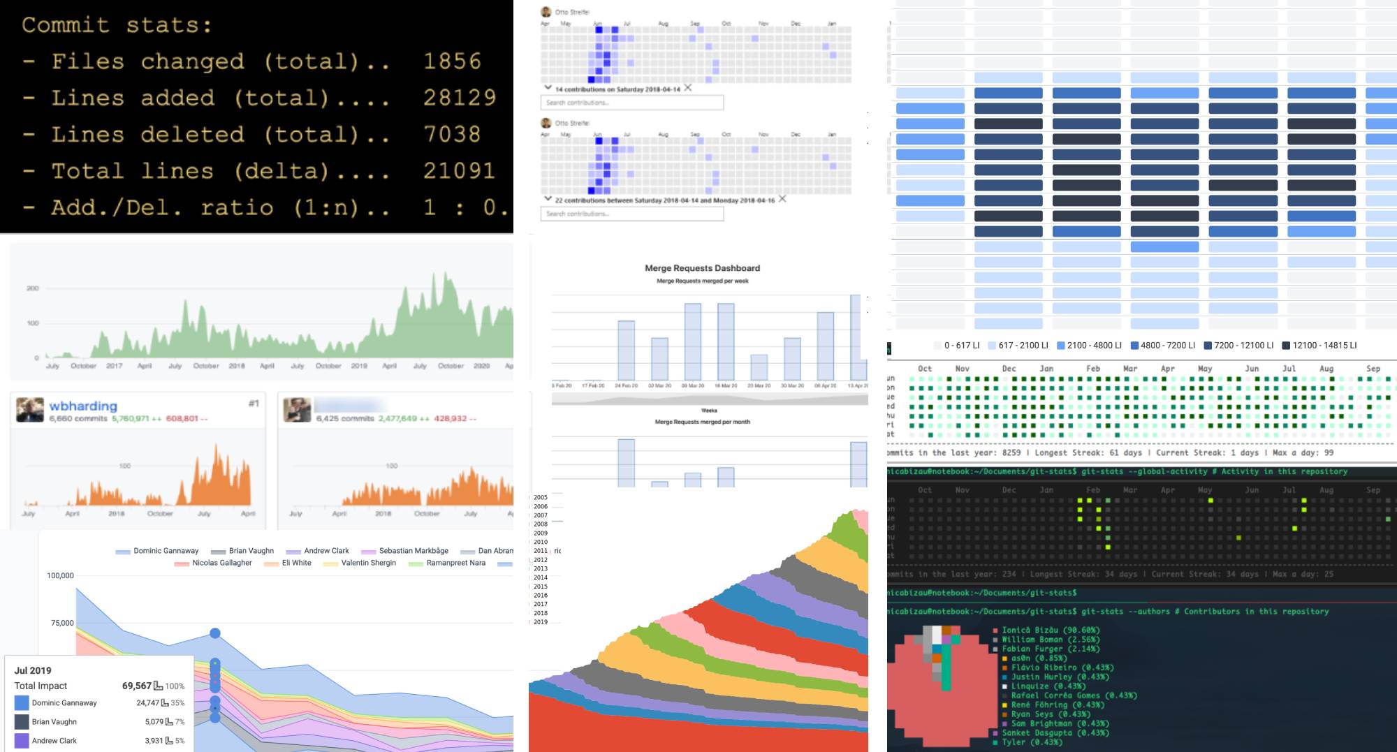 - hoxu/gitstats. 1,100 stars on GitHub. Developed in 2009. Screenshot example. Interesting because: It's the grandfather of all git stat tools, and still a high ranking Google result.