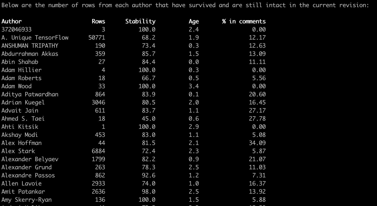 The latter chart also suggests a drawback of Hercules: dependencies (e.g., Tensorflow) and processing time. There is some heavy duty data processing necessary to create these reports, and the author has documented that these reports can strain under the weight of large development teams.