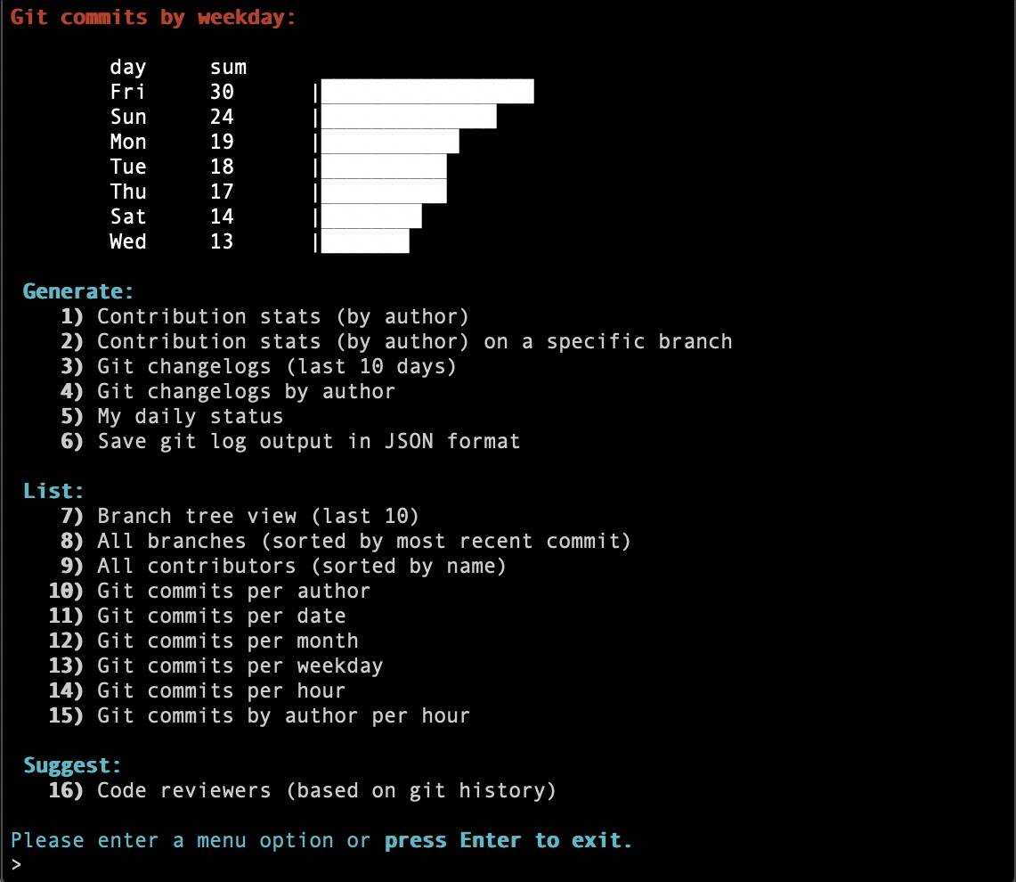 git-quick-stats is one of the few git tools that provides an interactive mode, which expedites the muddling that is typically required to get the free tools to output data over the desired time range and committer context.