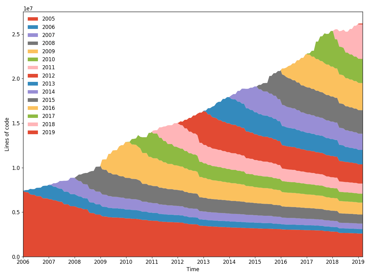 - git-of-theseus. 1600 stars on GitHub. Developed in 2018. Screenshot example. Interesting because: It has a robust featureset comparable to Hercules and is simpler to setup.