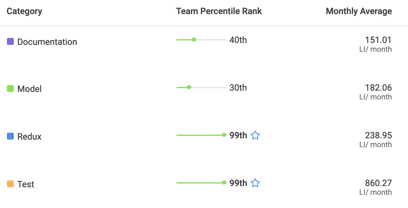 When it comes time to divide up tasks for the next sprint, this data affords the technical sprint master a leg up. They can, for example, delegate visual tasks to developers that are strongest in HTML, CSS, and Javascript. In contrast, the developer represented by the screenshot above could be a great candidate to tackle the team's most complex Jira issues. Their proficiency with tests confers serious benefits when laying the groundwork for tricky features.