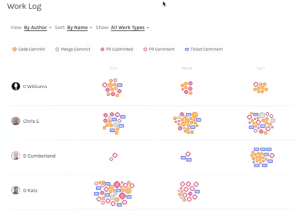 Velocity recently published a robust comparison between their features and Pluralsight's. If you're considering Velocity, I recommend checking out their article. It illustrates how Velocity shares with Pluralsight a common thread of ideology, features, and design elements. For example, both offer a "commit activity log" that use shapes of various color and size to represent commit activity: