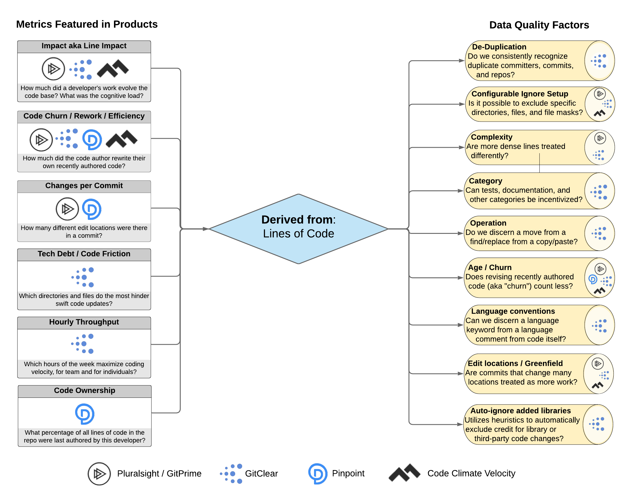 In the time since 2017, GitClear has shifted to differentiating based on data source quality. Since competing products rely so heavily on commits, pull requests, and issues, GitClear spent 2019 doubling down to prove that data quality matters. To the extent GitClear succeeds in creating a single reliable metric to capture code activity, managers can unambiguously see how active each developer has been -- whether they're comparing between teams' location (remote or on-site), domain (front-end or back-end), seniority (senior, mid-level, code school graduate), country (outsourcing vs not), etc. Plenty of companies claim to allow such broad comparisons. As of 2026, a new one falls out of a VC incubator every few months. But among competitors that back up their claims with detailed analysis of how signal is maximized and noise is minimized: GitClear stands alone in the fervor of this pursuit. Here is a graph from another article that outlines how much more exhaustively GitClear has worked to refine Lines of Code into a consistent, reliable data source. Note how many Data Quality Factors on the right side are unique to GitClear: